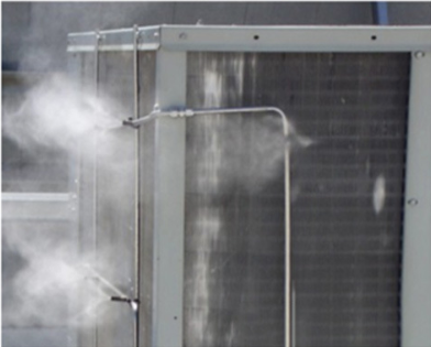 噴霧降溫系統(tǒng):水壓提高到2-10公斤,然后將加壓后的水經(jīng)耐壓輸送管道由專業(yè)噴嘴將其霧化,產(chǎn)生200μm左右的微霧顆粒,使其能夠迅速?gòu)目諝庵形諢崃客瓿善U(kuò)散,從而完成空氣加濕、降溫的目的。